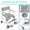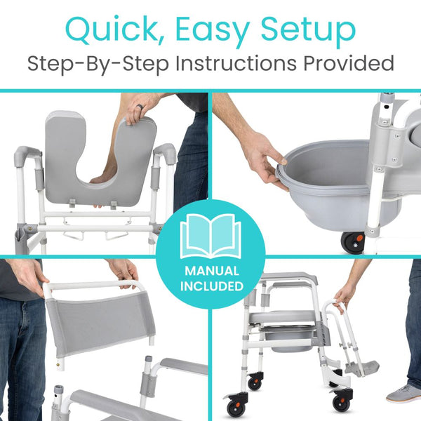 The Vive Shower Commode Transport Chair seamlessly integrates the functionalities of a shower chair, a commode, and a transport chair into a single efficient unit. This versatile chair simplifies mobility and care processes, significantly enhancing independence and comfort for users with mobility challenges